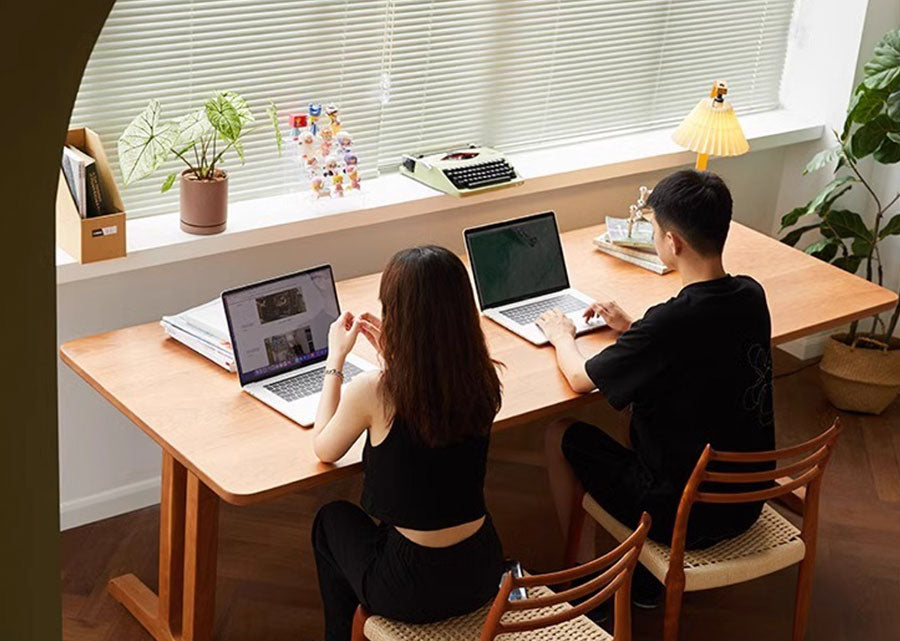 A heavy-set table with a luxurious 4cm thick tabletop and 6cm thick legs. Legs are set close to the edges, offering a generous amount of space in between the legs. There's also plenty of space under table, with a height of 72cm.