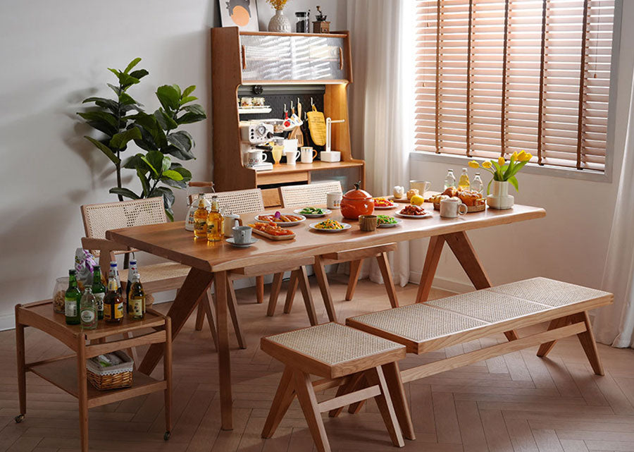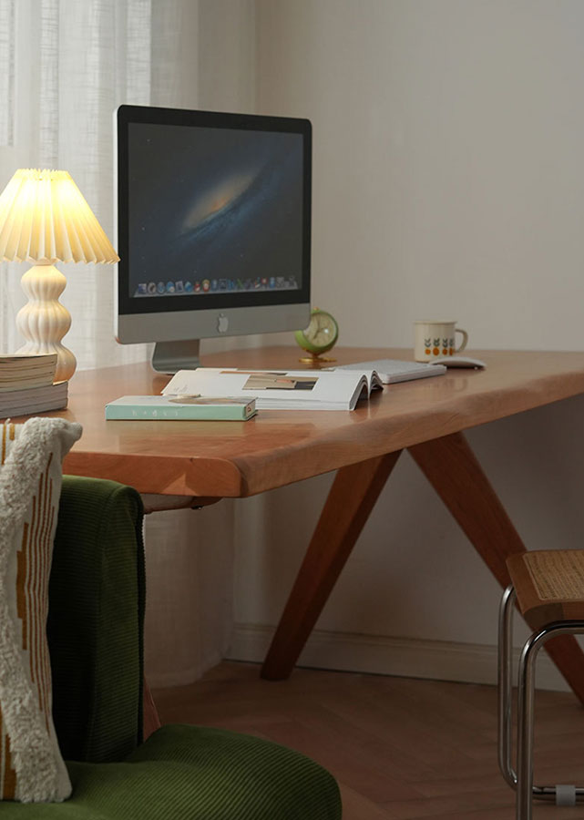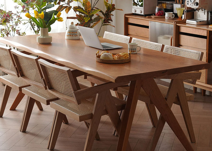 The Cetos Table is a bold statement piece made from solid cherry wood. Featuring a luxurious 3.4 cm thick tabletop and 4.5 cm thick rounded legs, it blends sculptural form with everyday functionality. Its subtly waved surface adds softness to its structured silhouette.