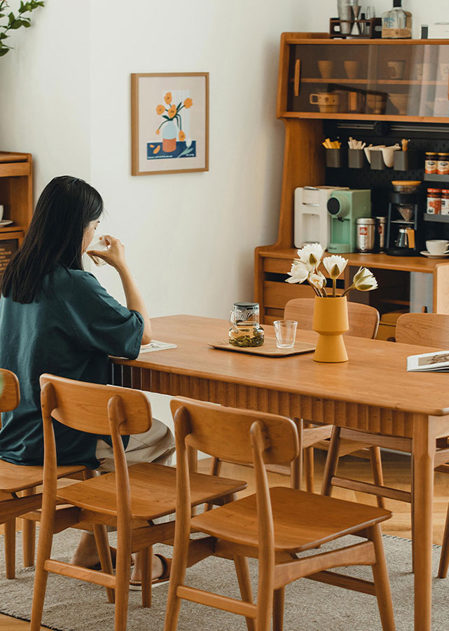The Fimbria Table brings elegance to everyday dining with its classic lines and charming fringe detail. Built from solid cherry wood, it offers a thoughtful hidden drawer for storing table essentials.