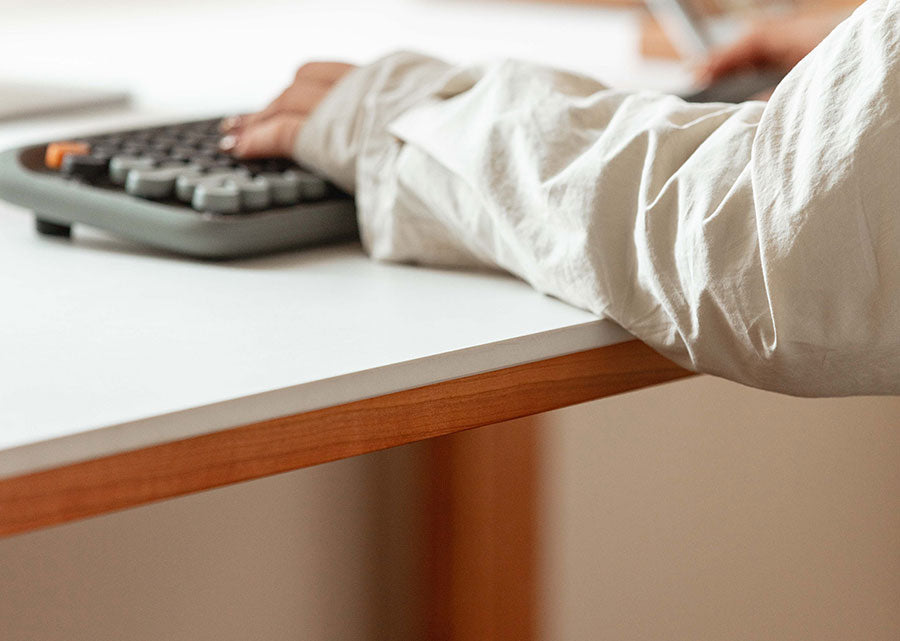 A refined table with a sintered stone top and solid cherry wood base—elegant, durable, and moisture-resistant.