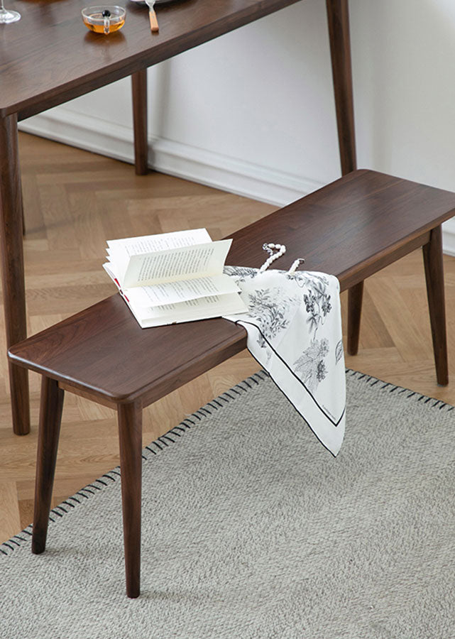 Crafted from Solid Dark Walnut, the Aplos Bench features rounded corners and a classic silhouette. A sturdy choice for dining, entryways, or foot-of-bed seating.